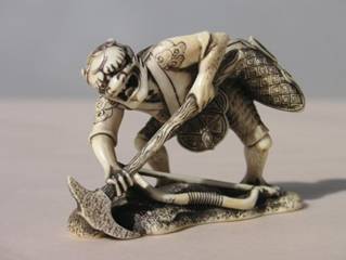 Out heroes get ready, and tool up for a days scouting in the wood. Kokuma has all his best tracking skills and equipment, and is going to show these Wajin just what an expert woodsman he really is. As he waits for the others, a fisherman presents him with a carved serpent's tooth, to commemorate his kill.