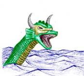Our heroes get ready. The fin approaches. When it gets really close, a huge serpentine head emerges from the water, and shows row upon row of long sharp teeth! A sea-serpent! The fight is on!