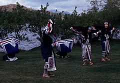 The feast is a great success. All the villagers participate in the dancing with the cranes. Haku and his wife, Kokuma, Miyoshi and his wife, Yoshi's wife and Kachamaru and his wife all perform well; only Kokuma's wife and Yoshi struggle, but the overall presentation is good. After sating themselves on wild boar meat, the heroes relax with the entire winter's supply of sloe gin and plum brandy. As the talking becomes more slurred, the subject turns to the world around them and they start giving names to its features. Already they have Miyoshiville (Miyoshi-kotan) and Lake Kokuma (Kokuma-ko), and Haku recently coined Kachamaru Bay (Kachamaru-wan). Miyoshi suggests Mount Yoshi (Yoshi-yama) for the big mountain above Lake Kokuma where they encountered the cat. Everyone falls about with laughter. Yoshi responds by naming Haku's Cave (Haku-hora'ana). And of course they always have Mineo's Passage (Mineo-tsuro). As the talking becomes even more slurred and the world starts turning around them, Haku makes up an epic poem about their various adventures at Kokuma-ko, Yoshi-yama, Kachamaru-wan and so on. It sounds hilarious when drunk.