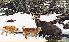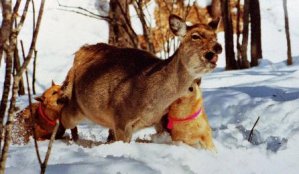 In the afternoon, Mineo, Haku and Miyoshi start constructing the third hut. Several of the wives work on the thatch, but Kuchiki and some of the older children go to cut down more trees. Kokuma and Kachamaru have other work: Pahlyonna has approached Kokuma to see if he wants to learn how to hunt with dogs. He is keen to do so. Kachamaru asks if he can tag along. They go out and see immediately both the great training and instincts the dogs have to hunt, and the control that Pahlyonna has over them. First they see the dogs scent, chase and bring down a young deer. Then they are even more impressed when they chase and kill a full-grown stag. Kokuma and Kachamaru try their hand at controlling the dogs, and although they fail, they learn much.