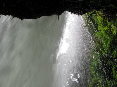 The next day the party reaches Lobster Valley, a place whose name no-one can understand as it is twenty miles from the sea. Kokuma and Kachamaru let the dogs go hunting again, and again they return empty-mouthed. Yoshi manages to catch a couple of otters and Mineo amazes the fishing gods with another fair catch. After a quick lunch, the adventurers press on and reach the creek running into the valley at its halfway point. Miyoshi, obsessed with naming places, calls it Crayfish Creek. Further up it forks, Miyoshi furnishing it with the name Fish Fissure. The sides grow steeper and higher, and the vegetation starts to cut off sight of the sky. Eventually it turns into a gully ("Guppy Gully") that ends at the foot of a waterfall. Miyoshi detects a faint path that seems to lead right into the waterfall. He can't quite believe it. Kokuma confirms there is a path, and follows it, sticking his head into the waterfall. He gets very wet and quite cold, but pushes on through and disappears. Miyoshi, afraid that Kokuma has been sucked into another dimension, sticks the shaft of his spear through the water, and is almost jerked off his feet as Kokuma pulls it, and him, through the waterfall. The others follow and find themselves in a tunnel behind the water curtain, leading under the mountain. Kachamaru casts Light and leads the way. After about ten minutes dominated by the smell of wet dogs, they emerge into a verdant valley with a large Ainu-style village. The valley seems to be surrounded by mountains - if there is another route out, it is not obvious. The inhabitants look pale and hairy like Ainu.