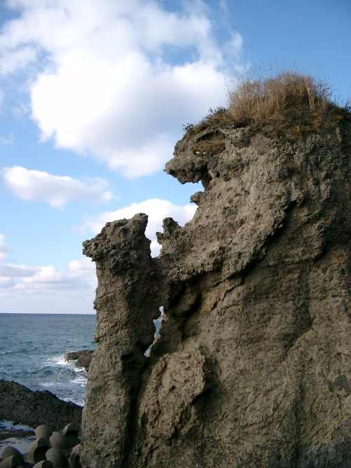 Hovering over the beach, he sees the river exiting from the cliffs and descends for a closer look. He smells blood and sees a big red pool in the shallows. Then he sees Kokuma emerging from the forest and converts back to his normal form. Kokuma tells him about the tragedy. Haku remarks, "Some days you get the bear; some days the bear gets you."† Miyoshi and Kachamaru emerge a few minutes later dragging the carcass of an enormous she-bear. Haku casts healing spells on them all then they set about skinning the bear and removing the meat. Kokuma examines the stomach for Mineo's remains but finds only flesh and small bones. He turns the stomach into a bag for carrying some of the meat back home. A fire is built, and while some bear meat is cooked Kokuma, Miyoshi and Kachamaru explore the river cave and Haku flies high to see the lie of the land. The river has a ledge running alongside it so they are able to get quite a way upstream without having to swim. They think they are not far from the cavern before the cave roof gets too low to allow further dry progress. They retrace their steps to the beach and start to eat the bear meat. It is starting to get dark. Haku has not returned. The wind is blowing off the sea and it is bitterly cold. The three adventurers decide to find somewhere more sheltered to eat and possibly camp for the night, so they head down the beach towards the rock outcrop. As they approach it, Kachamaru notices that it looks like a great big bear with a cub. The others look up in alarm, but it really is just a rock outcrop with an unusual shape. They reach the foot of the rock and suddenly they see around the bend in the coast that there is a small town about half a mile away - a Wajin town. "Oh great, that's all we need, another battle with the Wajin for space to live and meat to eat!" complains Kachamaru. "What's the matter?" inquires Kokuma. "I thought you said there were too many teddy bears and not enough space battles!"†