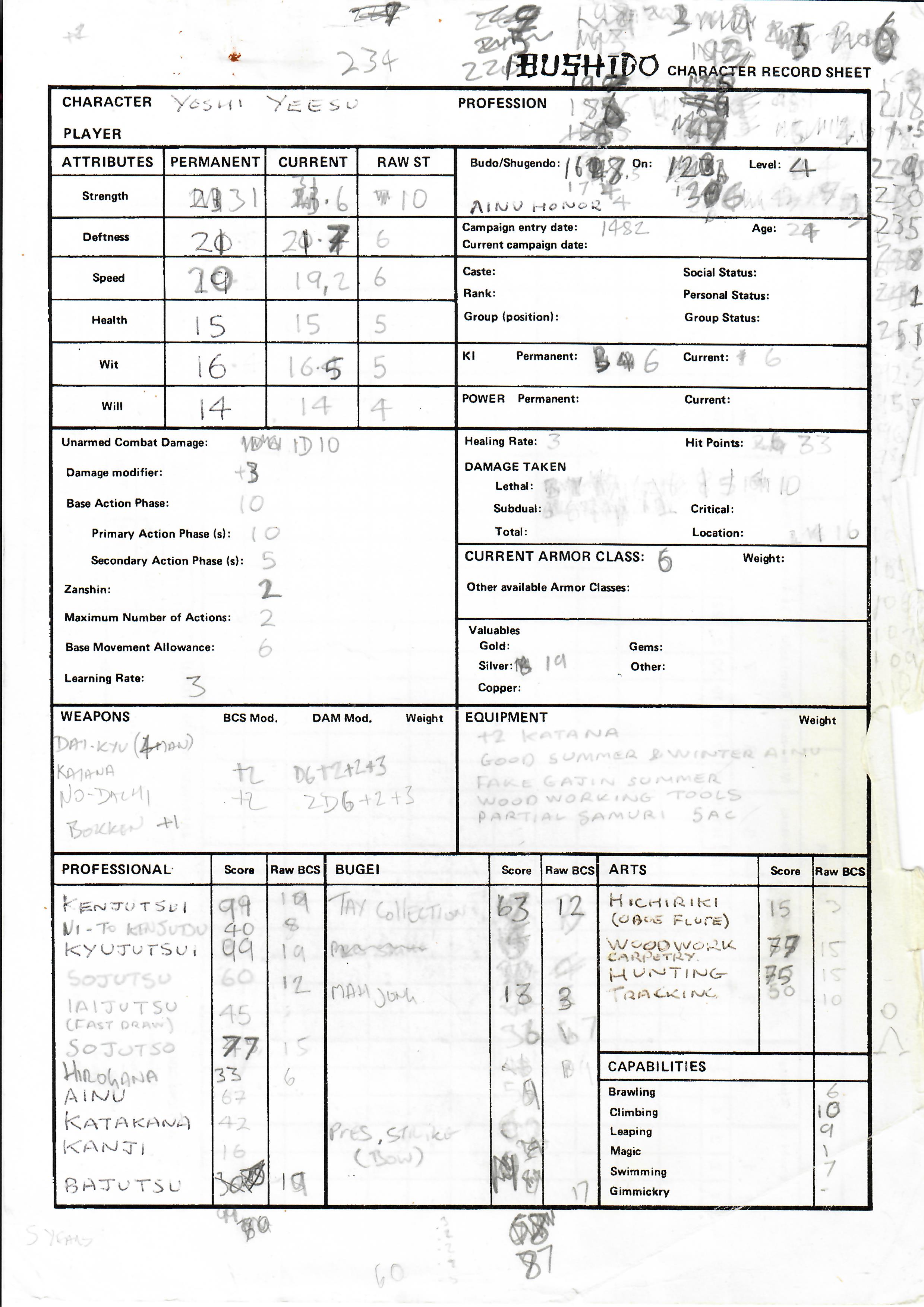 Traumatised by his early adventures, Yoshi Yeesu hates his father's decision to leave the Wajin world of clean beds on wooden floors for the Ainu world of skins and moss on a dirt floor and wholesome food. He also despises his father for disappearing leaving him to support his mother, brother and sister especially as his mother was never very fit. So he has decided he wants to escape the life of an Ainu and become a Wajin. He has made it his aim to convert as many of the youngsters to his ideals as possible seeing the older generation as stuck-in-the-mud no-hopers. To that end he extols the virtues of what he has seen and done to anyone who will listen. Like ride a horse, killing ghosts and eating proper food. As a result he has avidly learnt anything his father and other ex-Wajin could teach him about Wajin life. With his father's blessing he has learned more about Wajin woodworking from Kokuma's wife, using it as an excuse to get out of learning herbalism and, as his father was more interested in teaching his sister herbalism, he never pushed the subject. He wears his interpretation of Wajin clothing made by his doting mother. He is ready to take on the world. |