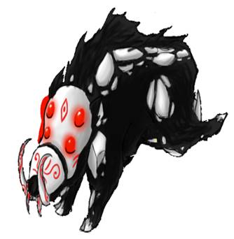 Autumn starts scratching back, but luckily it is in the toughest hardest, most solidly-built part of the city defences. A few yards away the scratching intensifies and in a burst of rubble and masonry, a large and ferocious creature bursts forth. It is about three-feet high at the shoulder has a jet-black body, with white bone-like plates on its shoulders and joints. It has large tusks in its jaw, curved forward and sharp. Four intense ruby-red eyes glower evilly in its face, which is surrounded by a bony plate upon which are angry red swirls. – A Boarbatusk!